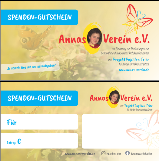 Ihr Geschenk soll vielmehr als die üblichen Geschenke sein, gleichzeitig einen Sinn haben und einen guten Zweck unterstützen? Sie möchten als Privatperson oder Firma zu besonderen Anlässen ein Herzensprojekt zur Hilfe kommen? Dann verschenken Sie doch einen Spenden-Gutschein und unterstützen Sie dadurch die Arbeit von Annas Verein und unserer Beratungsstelle Papillon in Trier. Mit dem Spenden-Gutschein von Annas Verein finden Sie für jeden besonderen Anlass im Handumdrehen eine originelle Geschenkidee, mit der Sie gleichzeitig einen guten Zweck unterstützen. Teilen Sie uns über unsere Homepage oder gerne per E-Mail den gewünschten Betrag für Ihren Spenden-Gutschein mit. Sobald der Betrag für das Geschenk auf unserem Konto gutgeschrieben wurde, wird der Spenden-Gutschein direkt zu Ihnen oder dem Beschenkten versendet. Ganz so wie der/die Spender/in es wünscht. Für die Spendenbeiträge erhalten Sie als Schenker/in eine Spendenquittung.