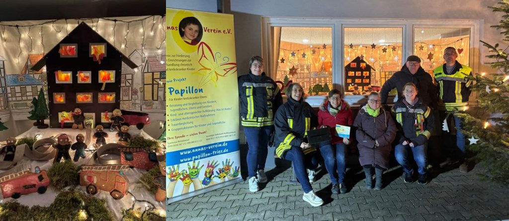 Den Abschluss der Adventsfenster für Annas Verein machte die Kinder- und Jugendfeuerwehr Zeltingen-Rachtig. Hier wurde am 21. Dezember 2024 am Feuerwehrhaus das wunderschöne Adventsfenster mit dem Thema „Lebkuchen Feuerwehr-Einsatz“ geöffnet. Schon bei den Vorbereitungen duftete das Feuerwehrhaus herrlich nach Lebkuchen. So konnten die zahlreichen Besucherinnen und Besucher das mit viel Liebe zum Detail gestaltete Fenster bei leckeren Getränken und Köstlichkeiten bewundern und miteinander ins Gespräch kommen. Hier konnte die unglaubliche Spendensumme in Höhe von 1076,96 € an Annas Verein übergeben werden.